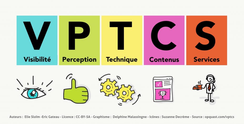 Elie Sloïm présente VPTCS ainsi : « cela veut dire Visibilité, Perception, Technique Contenus et Services. Visibilité, c’est la capacité d’un site à être trouvé par ses utilisateurs. La Perception c’est l’aptitude à être correctement perçu. La Technique, c’est que le site fonctionne. Les Contenus, il s’agit que les contenus soient de bonne qualité. Et les Services c’est le fait que ce qui se passe après la visite se fasse dans de bonnes conditions. Donc l’une des questions qui se pose c’est pour le mémoriser, parce que VPTCS ce n’est pas facile à mémoriser. Donc vous pouvez utiliser Va Pas Te Croire Supérieur, cela marche bien et puis cela correspond bien à notre philosophie ».